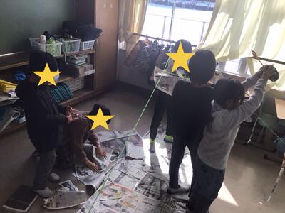 教室に張り巡らせた毛糸に、長くちぎった新聞紙をつけていきました。